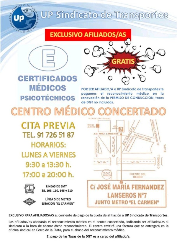 Por ser afiliado/a a UP Sindicato de Transportes, al corriente de los pagos de la cuota, te pagamos el reconocimiento médico en la renovación de tu permiso de conducción, tasas DGT no incluidas.