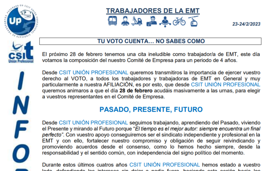 Ha llegado el momento de marcar el camino, nuestro camino, para mantener y mejorar el bienestar laboral-familiar, tu día a día y tu futuro. Los compañeros que se jubilaron lucharon para que tú tengas este presente, lucha mediante tu voto el día 28 de febrero de 2023 por un futuro aún mejor.