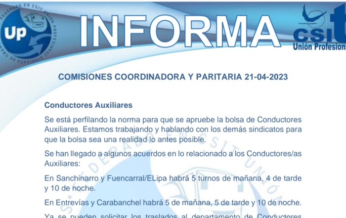 En este comunicado repasamos la actualidad de los siguientes temas: Conductores auxiliares Talleres WC en ...