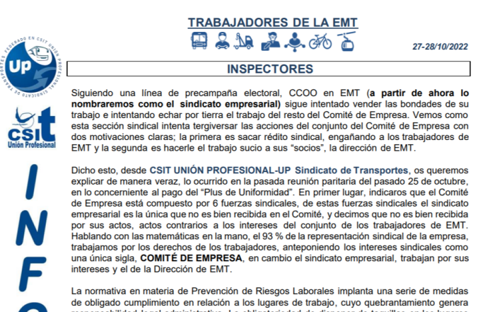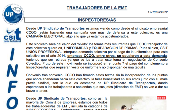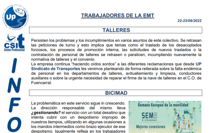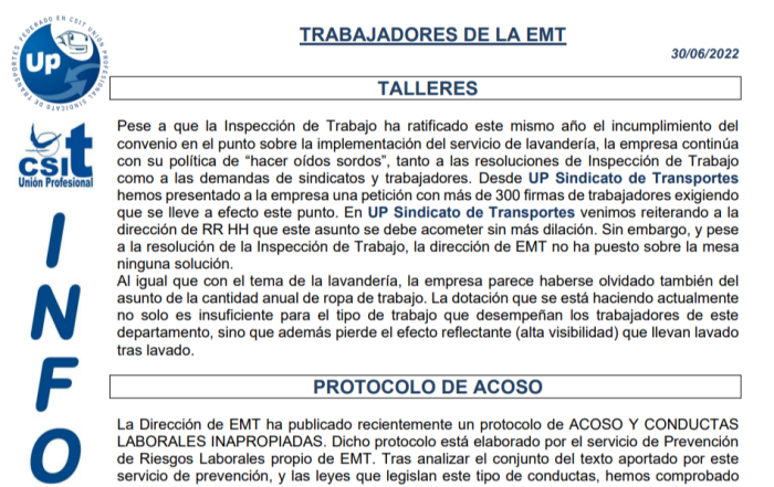 En este comunicado repasamos la actualidad de los siguientes temas: Talleres Inspección de trabajo EMT ...