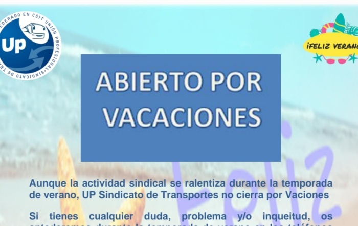 Os seguiremos atendiendo. UP INFORMA Abierto por vacaciones UP SINDICATO DE TRANSPORTES SIEMPRE CONTIGO.