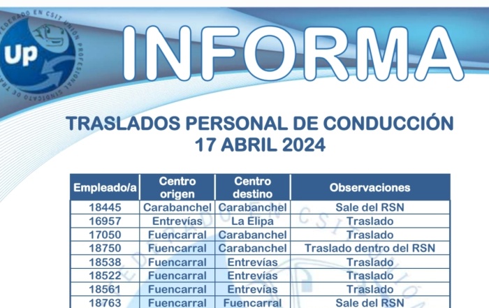 Os informamos de los traslados del personal de conducción a dñfecha 17 de abril de ...