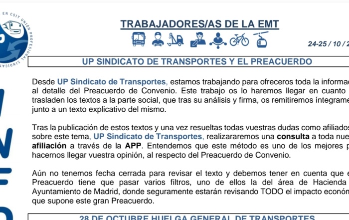 En este comunicado repasamos los siguientes temas de actualidad: UP Sindicato de Transportes y el precauerdo Huelga general de transporte el día 28 de octubre ...