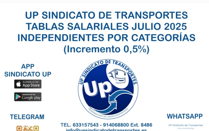 Nueva subida salarial en la EMT de Madrid. Descarga el PDF UP Tablas Salariales Julio 2025+0,5% UP SINDICATO DE TRANSPORTES SIEMPRE CONTIGO.