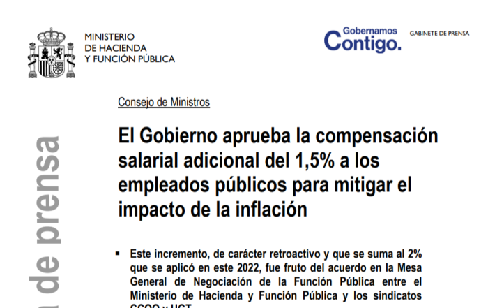 El Gobierno aprueba la compensación salarial adicional del 1,5% a los empleados públicos para mitigar el impacto de la inflación Descarga el PDF Subida adicional ...