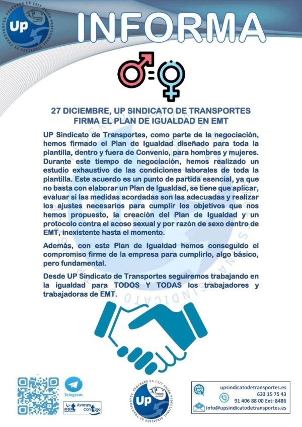 Después de mucho trabajo y negociaciones se ha llevado a un acuerdo y podemos decir que la EMT de Madrid tiene un Plan de Igualdad. ¡ENHORABUENA!