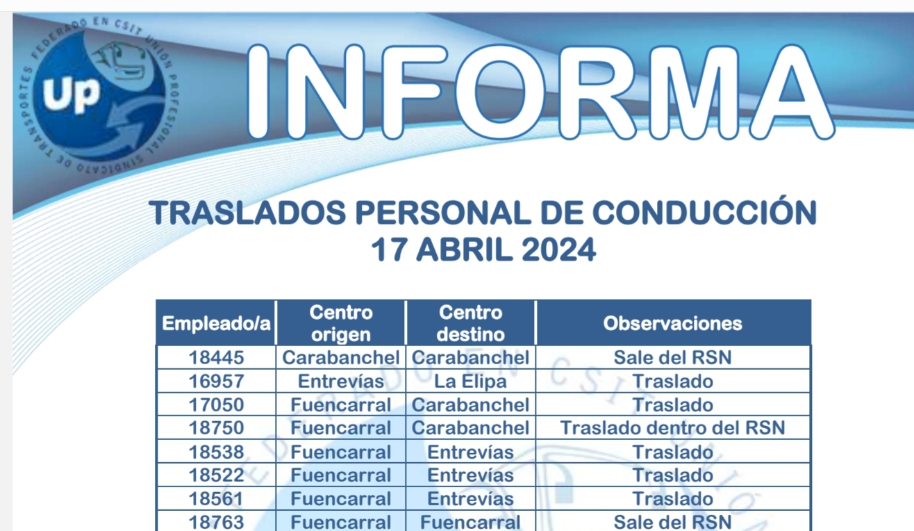 Os informamos de los traslados del personal de conducción a dñfecha 17 de abril de 2024